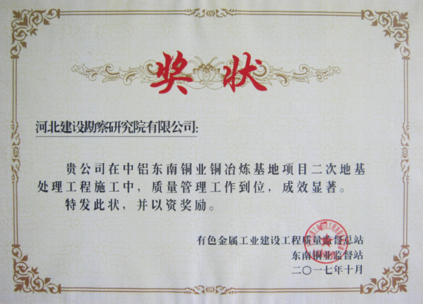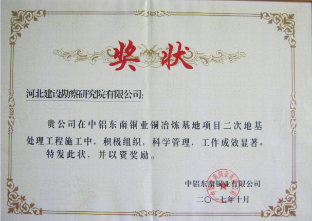 公司承接的福建省寧德市中鋁東南銅業(yè)銅冶煉基地項(xiàng)目二次地基處理工程,施工中嚴(yán)格執(zhí)行公司規(guī)章制度及綜合管理體系標(biāo)準(zhǔn),精心策劃,嚴(yán)格控制,科學(xué)管理。在現(xiàn)場(chǎng)10多家施工單位各項(xiàng)檢查評(píng)比中,得到了業(yè)主中鋁東南銅業(yè)有限公司的表?yè)P(yáng),對(duì)現(xiàn)場(chǎng)安全、質(zhì)量、進(jìn)度管理給予了高度評(píng)價(jià),分別授予“項(xiàng)目管理突出”獎(jiǎng)和“質(zhì)量管理”獎(jiǎng)。