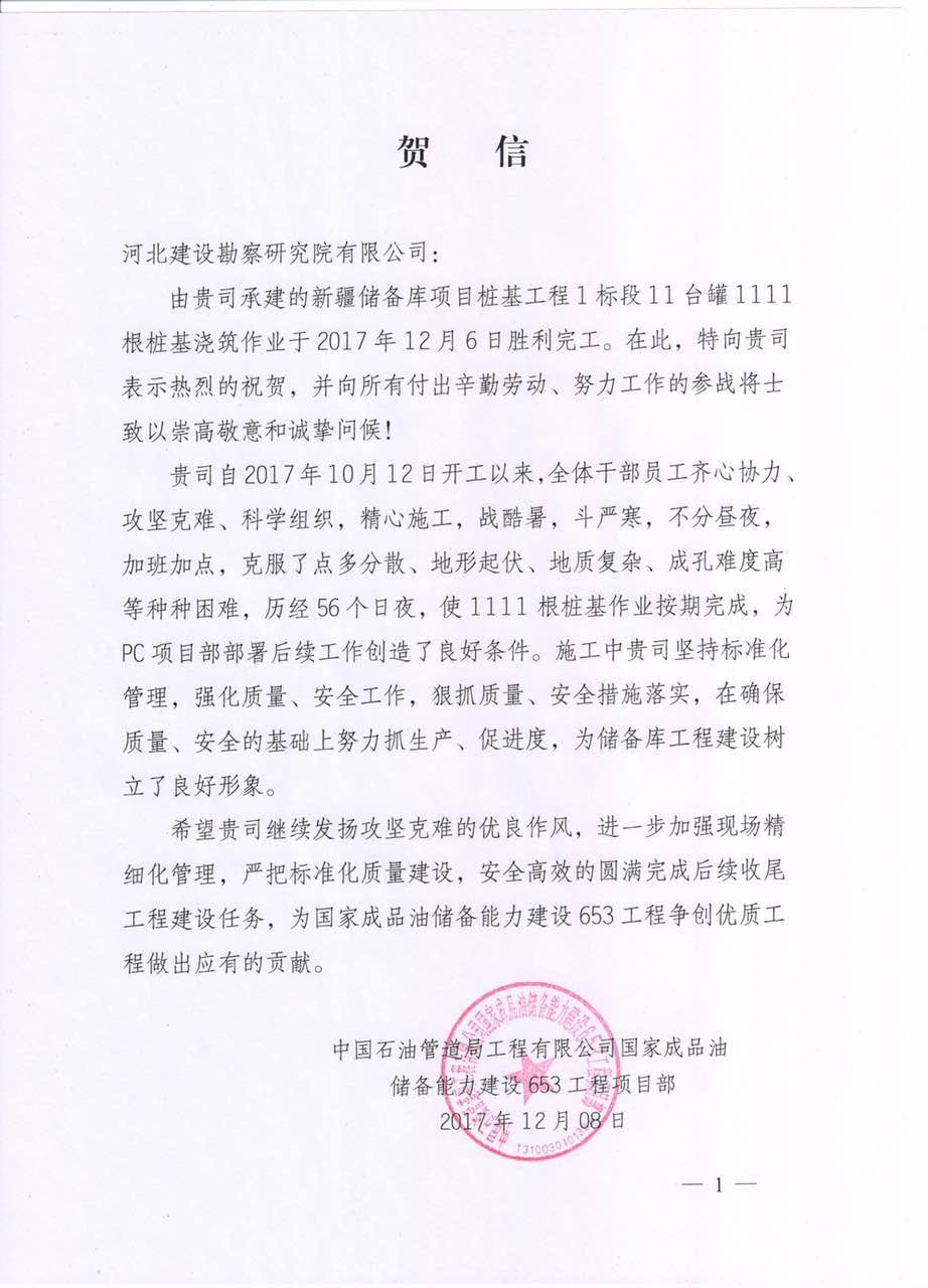我公司承建的新疆儲備庫項目樁基工程1標段11臺罐1111根樁基澆筑作業(yè)于2017年12月6日勝利完工。中國石油管道局工程有限公司國家成品油儲備能力建設653工程項目部發(fā)來賀信,對我項目部重安全,重質(zhì)量的工作作風表示充分地肯定,也對我項目部為儲備庫工程建設樹立良好形象提出了表揚。