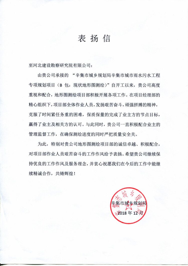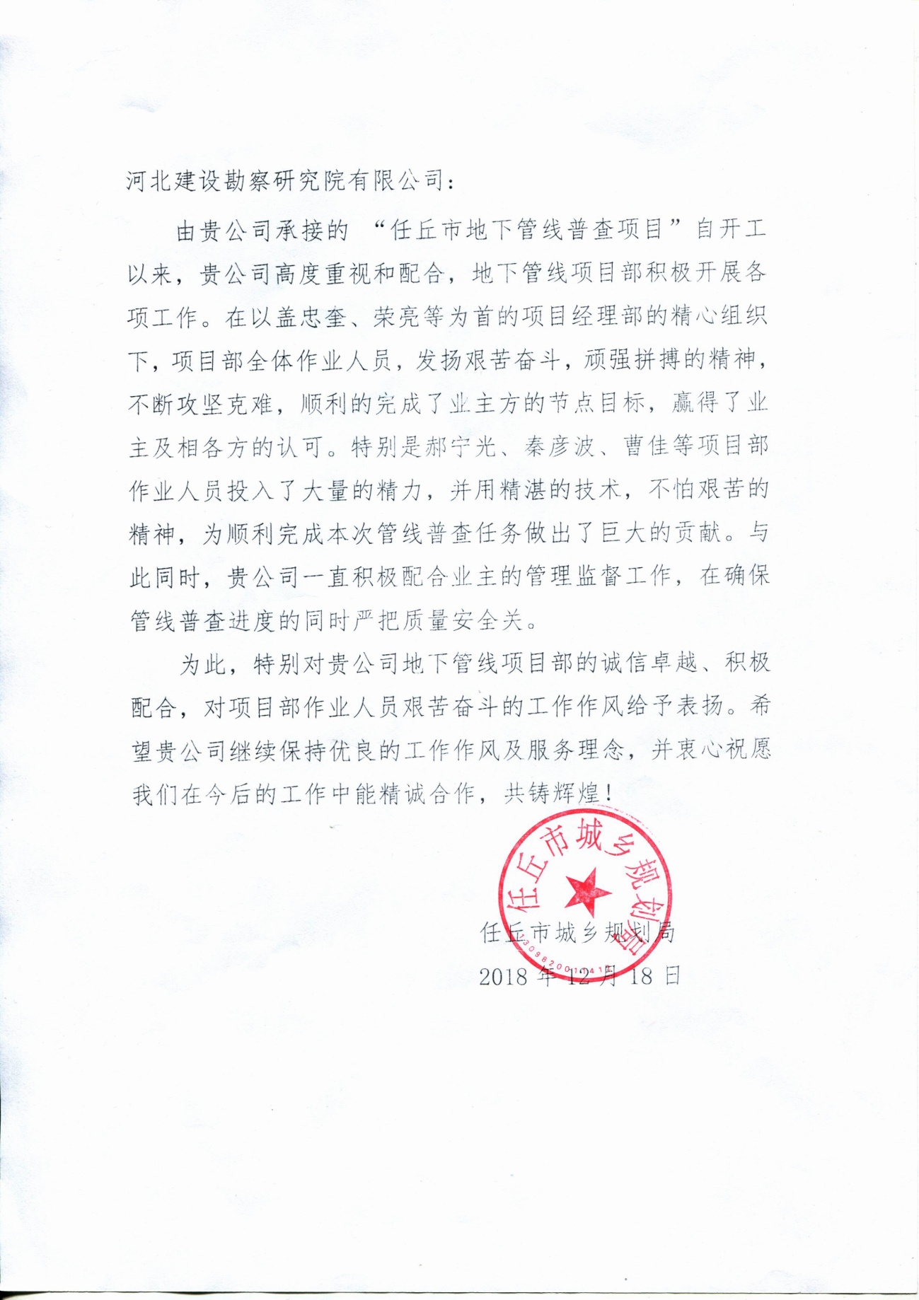 近日,公司收到辛集市城鄉(xiāng)規(guī)劃局和任丘市城鄉(xiāng)規(guī)劃局發(fā)來的表揚(yáng)信,分別對(duì)我公司誠信卓越、積極配合及項(xiàng)目部作業(yè)人員艱苦奮斗的工作作風(fēng)給予表揚(yáng)。特別是在任丘地下管線普查項(xiàng)目中,在以蓋忠奎、榮亮為代表的項(xiàng)目部精心組織下,項(xiàng)目全體作業(yè)人員,發(fā)揚(yáng)艱苦奮斗、頑強(qiáng)拼搏的精神,不斷攻堅(jiān)克難,保質(zhì)保量提前完成了生產(chǎn)任務(wù),贏得了業(yè)主的認(rèn)可。甲方特發(fā)來表揚(yáng)信,對(duì)我公司所作出的貢獻(xiàn)表示感謝!并希望我們繼續(xù)保持優(yōu)良的工作作風(fēng)及服務(wù)理念,精誠合作,共創(chuàng)輝煌!