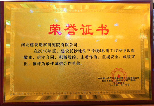 我公司承建的長(zhǎng)沙地鐵三號(hào)線(xiàn)4標(biāo)施工監(jiān)測(cè)項(xiàng)目,自開(kāi)工以來(lái)精心策劃、有效組織、認(rèn)真施工、積極與業(yè)主配合。施工過(guò)程中我公司認(rèn)真敬業(yè),信守合同,積極履約,主動(dòng)作為,重視安全,成績(jī)突出,中鐵建大橋工程局集團(tuán)特授予我公司 “最佳誠(chéng)信合作單位”榮譽(yù)獎(jiǎng)牌,以示表彰!