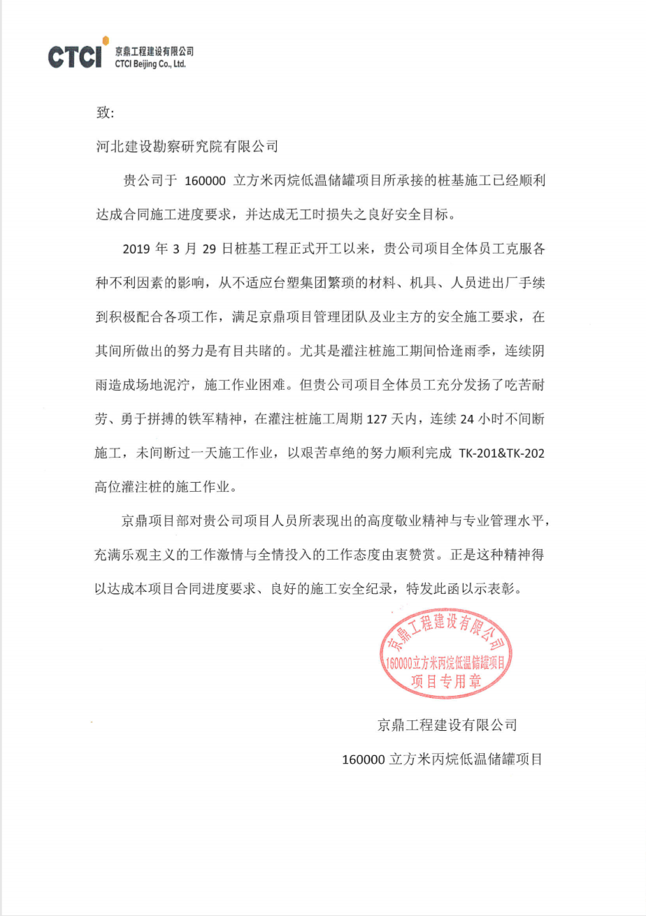 我公司承接的160000立方米丙烷低溫儲(chǔ)罐樁基施工工程,自開工以來,項(xiàng)目部全體員工克服各種不利因素的影響,經(jīng)過艱苦卓絕的不懈努力,已順利達(dá)成合同施工進(jìn)度要求,并達(dá)成無工時(shí)損失之良好安全目標(biāo),滿足京鼎項(xiàng)目團(tuán)隊(duì)及業(yè)主方的安全施工要求,已圓滿完成各項(xiàng)施工任務(wù),順利完工。期間所表現(xiàn)出的高度敬業(yè)精神和專業(yè)管理水平,得到了業(yè)主和監(jiān)理的一致好評(píng),近期特向我公司發(fā)函予以表揚(yáng)。