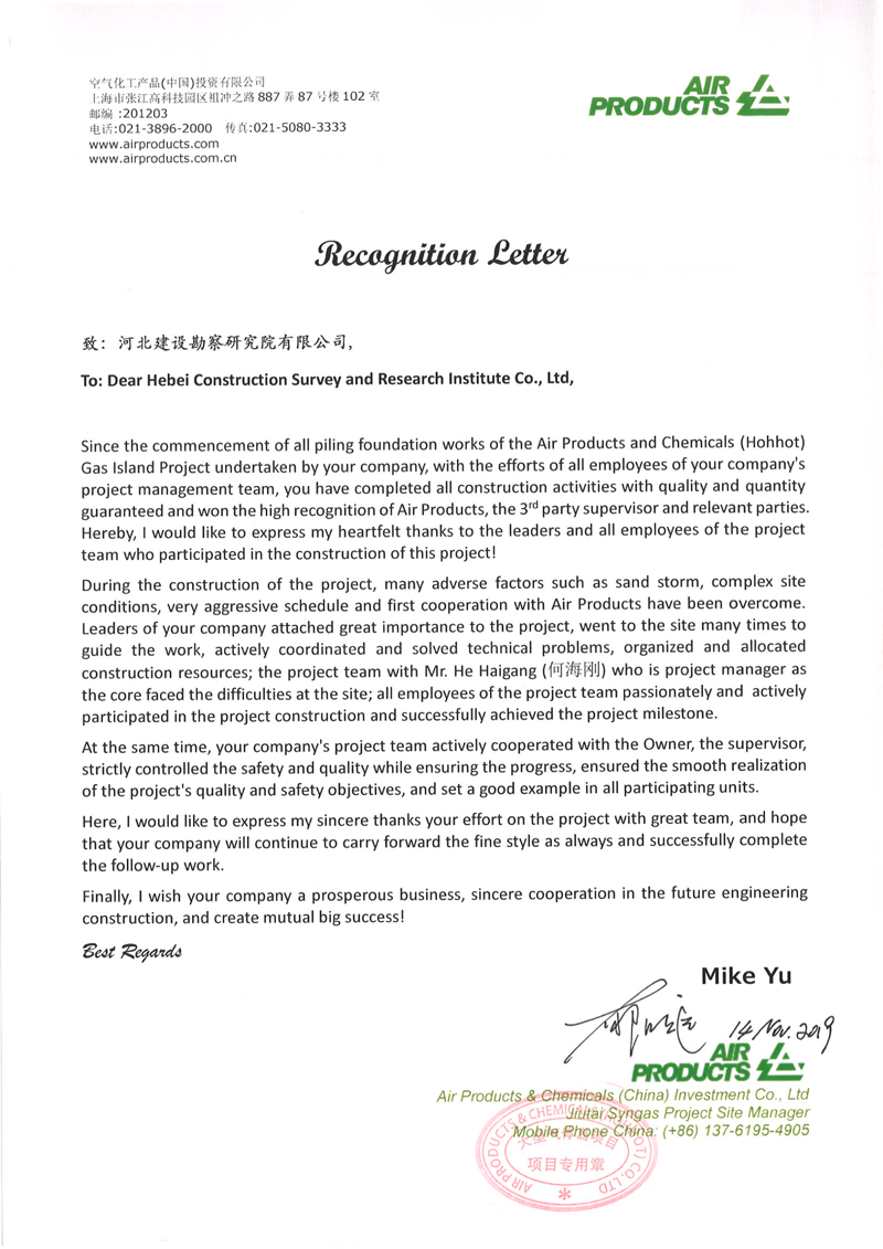 我公司承建的美國AP公司大型氣體島項目,安全、優(yōu)質(zhì)完成了全部地基處理任務。施工期間克服天氣寒冷、工期緊等因素,投入旋挖鉆機8臺套,一個月完成灌注樁20000立方,取得了業(yè)主的一致好評。