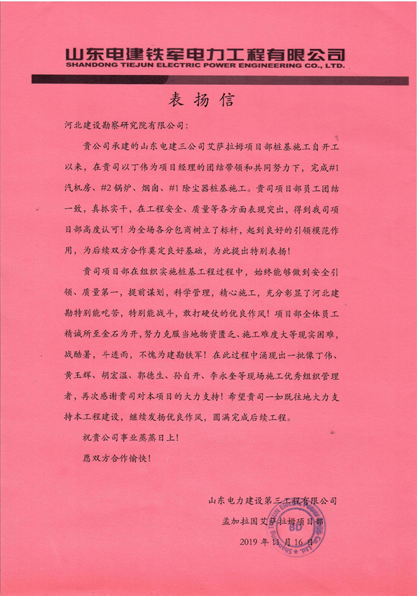 孟加拉艾薩拉姆項(xiàng)目部收到總包山東電建三公司表揚(yáng)信
