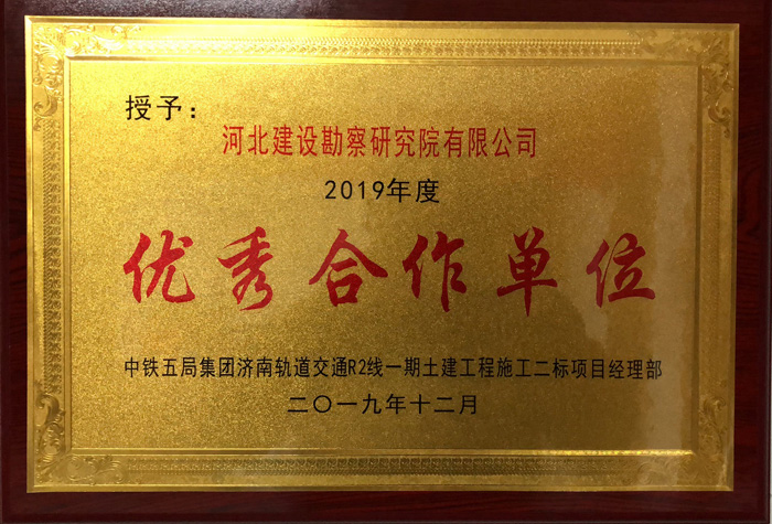 由我公司承接的濟南市軌道交通R2線施工監(jiān)測項目,近日收到中鐵五局集團濟南地鐵項目部的表揚信,并授予我公司“2019年度優(yōu)秀合作單位”、郝迪培班組“2019年度優(yōu)秀班組”兩項榮譽獎牌。