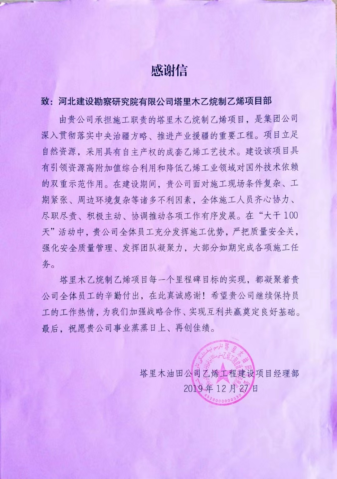 公司近日收到業(yè)主塔里木油田公司乙烯工程建設(shè)項目經(jīng)理部的感謝信及中國寰球工程有限公司北京分公司的質(zhì)量管理先進集體錦旗。在建設(shè)期間,我公司面對現(xiàn)場條件復(fù)雜、工期緊張等諸多不利因素,全體施工人員齊心協(xié)力、盡職盡責(zé)、積極主動、協(xié)調(diào)推動各工作有序開展,在施工中,嚴(yán)把質(zhì)量安全觀、強化安全質(zhì)量管理、發(fā)揮團隊凝聚力,很好的完成了各項施工任務(wù),為雙方進一步加強戰(zhàn)略合作、實現(xiàn)互利共贏奠定了良好基礎(chǔ)。