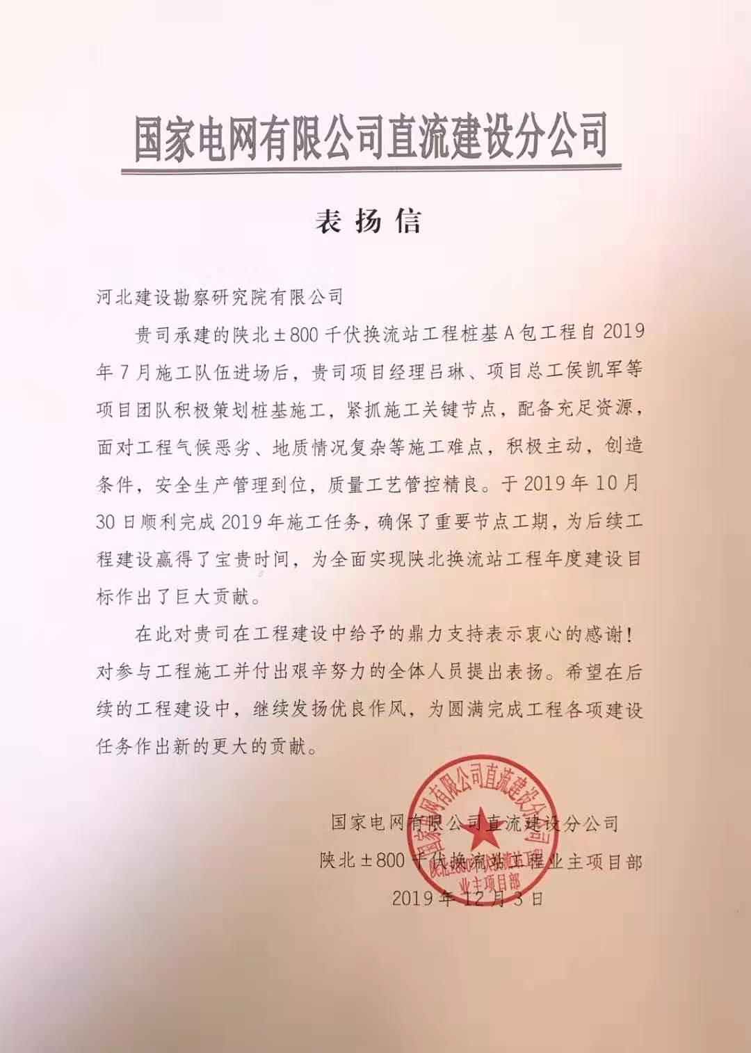 另有陜北換流站項目部也收到國家電網(wǎng)直流建設(shè)分公司的感謝信,該項目自2019年7月進場后,在項目經(jīng)理呂琳、項目總工侯凱軍等精心組織和艱苦努力下,順利完成施工任務(wù),確保了重要節(jié)點工期,為后續(xù)工程建設(shè)贏得了寶貴時間,為全面實現(xiàn)陜北換流站工程年度建設(shè)目標(biāo)作出巨大貢獻,受到業(yè)主的充分肯定和高度表揚。