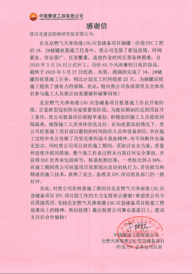 由我公司承建的北京燃?xì)馓旖蚰细跮NG應(yīng)急儲(chǔ)備項(xiàng)目1#、2#儲(chǔ)罐樁基工程,自2020年3月24日正式開工,歷經(jīng)65個(gè)日夜的奮戰(zhàn),最終于2020年5月27日優(yōu)質(zhì)、高效、圓滿的完成了1#、2#儲(chǔ)罐的樁基施工任務(wù)。中國(guó)寰球工程有限公司北京燃?xì)馓旖蚰细跮NG應(yīng)急儲(chǔ)備項(xiàng)目?jī)?chǔ)罐一階段EPC項(xiàng)目組,對(duì)我公司北燃樁基項(xiàng)目組表示由衷的感謝,感謝我公司領(lǐng)導(dǎo)及全體項(xiàng)目施工人員的辛勤付出,在克服了新冠疫情、時(shí)間緊張、作業(yè)面廣、任務(wù)繁重、連續(xù)作業(yè)時(shí)間長(zhǎng)等各種困難的情況下,奮勇向前,較原定工期提前25天完成施工任務(wù),為項(xiàng)目后續(xù)施工帶來了強(qiáng)有力的工期保障。同時(shí)對(duì)我公司在樁基施工期間對(duì)北京燃?xì)馓旖蚰细跮NG應(yīng)急儲(chǔ)備項(xiàng)目EPC項(xiàng)目組工作的大力支持表示感謝!希望我公司今后再接再厲,繼續(xù)發(fā)揚(yáng)迎難而上的精神,再創(chuàng)佳績(jī)!