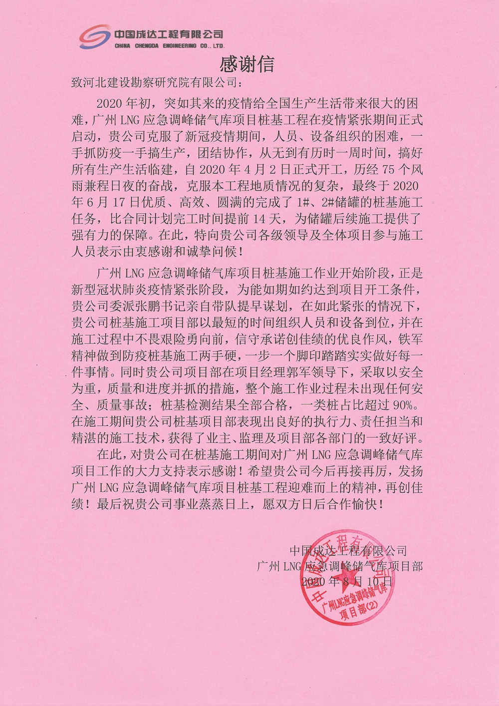 近日,我公司廣州LNG應急調峰儲氣庫項目收到成達公司發(fā)放的感謝信。廣州LNG應急調峰項目是我公司首次在LNG行業(yè)打入廣州市場,也是首次和中國成達工程公司進行合作,項目部全體員工發(fā)揚公司的鐵軍精神做到防疫施工兩手硬,不畏艱險勇向前,齊心協(xié)力、積極策劃,圓滿的完成了各項任務,為廣州LNG應急調峰項目順利實施打下良好的基礎;在施工中,項目安全生產管理到位,質量工藝管控優(yōu)良,贏得了業(yè)主、監(jiān)理及相關各方高度認可。對全體參建本項目的領導與員工表示了衷心的感謝,并希望在后續(xù)的工程建設中,繼續(xù)發(fā)揚河北建勘的優(yōu)良工作作風!