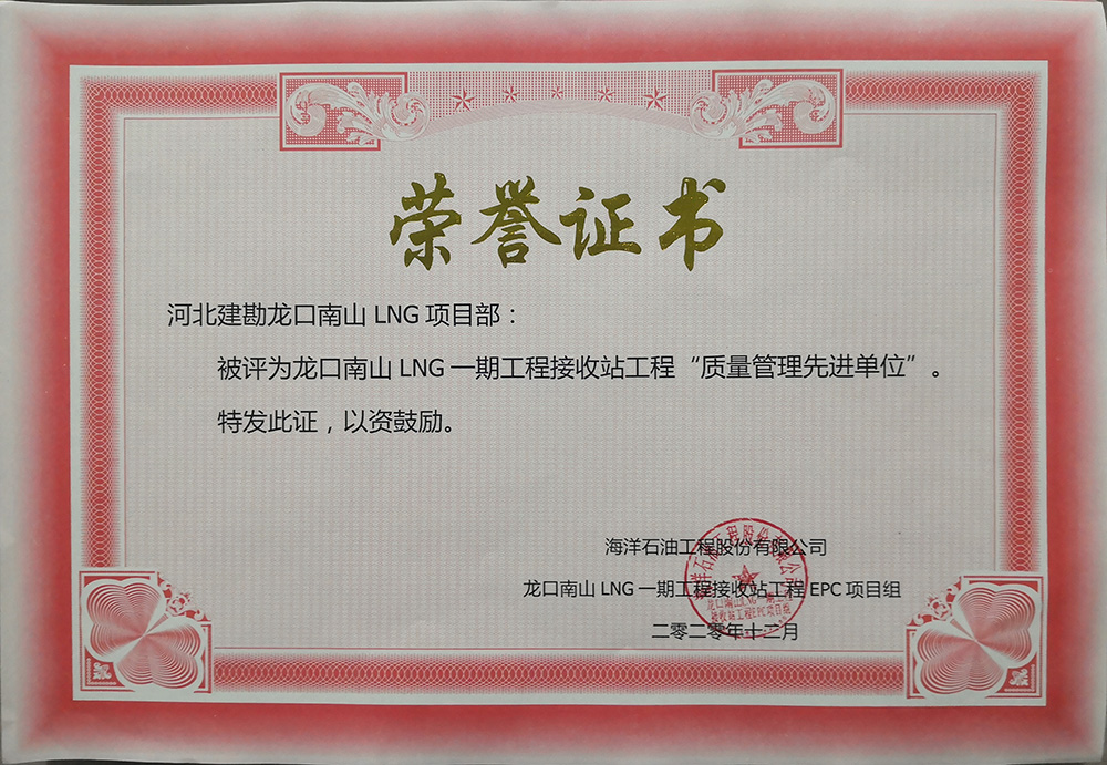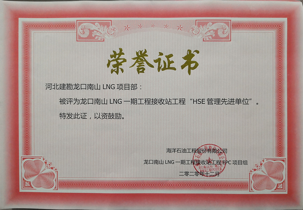 2020年12月,公司收到海洋石油工程股份有限公司發(fā)來的表揚(yáng)信,對(duì)我公司在龍口南山LNG一期工程接收站工程EPC項(xiàng)目儲(chǔ)罐樁基工程標(biāo)段一施工過程中,面對(duì)施工現(xiàn)場地質(zhì)情況復(fù)雜、新工藝、施工難度大、氣候炎熱多雨、新冠疫情、人材機(jī)緊缺等不利因素,按合同要求順利完成了一標(biāo)段1#和2#儲(chǔ)罐3497根振沖碎石樁和720根樁柱一體化灌注樁全部施工任務(wù),給予了高度認(rèn)可和好評(píng),并表示感謝!我公司被評(píng)為“質(zhì)量管理先進(jìn)單位”和“HSE管理先進(jìn)單位”并頒發(fā)了榮譽(yù)證書,同時(shí)對(duì)先進(jìn)個(gè)人頒發(fā)了“優(yōu)秀項(xiàng)目管理者”、 “HSE管理先進(jìn)個(gè)人”、 “質(zhì)量管理先進(jìn)個(gè)人”榮譽(yù)證書。