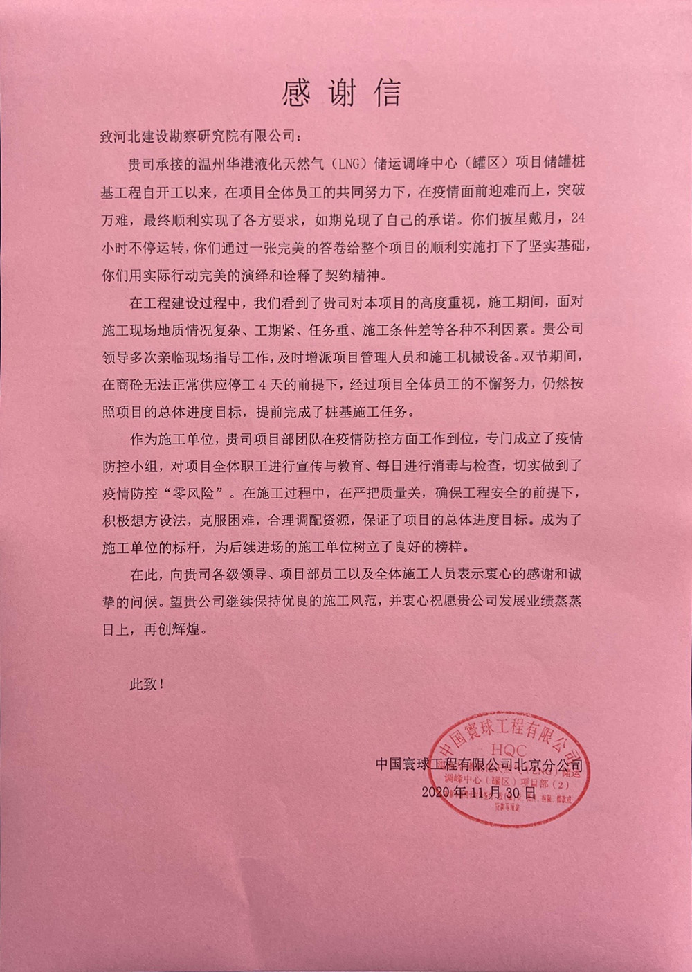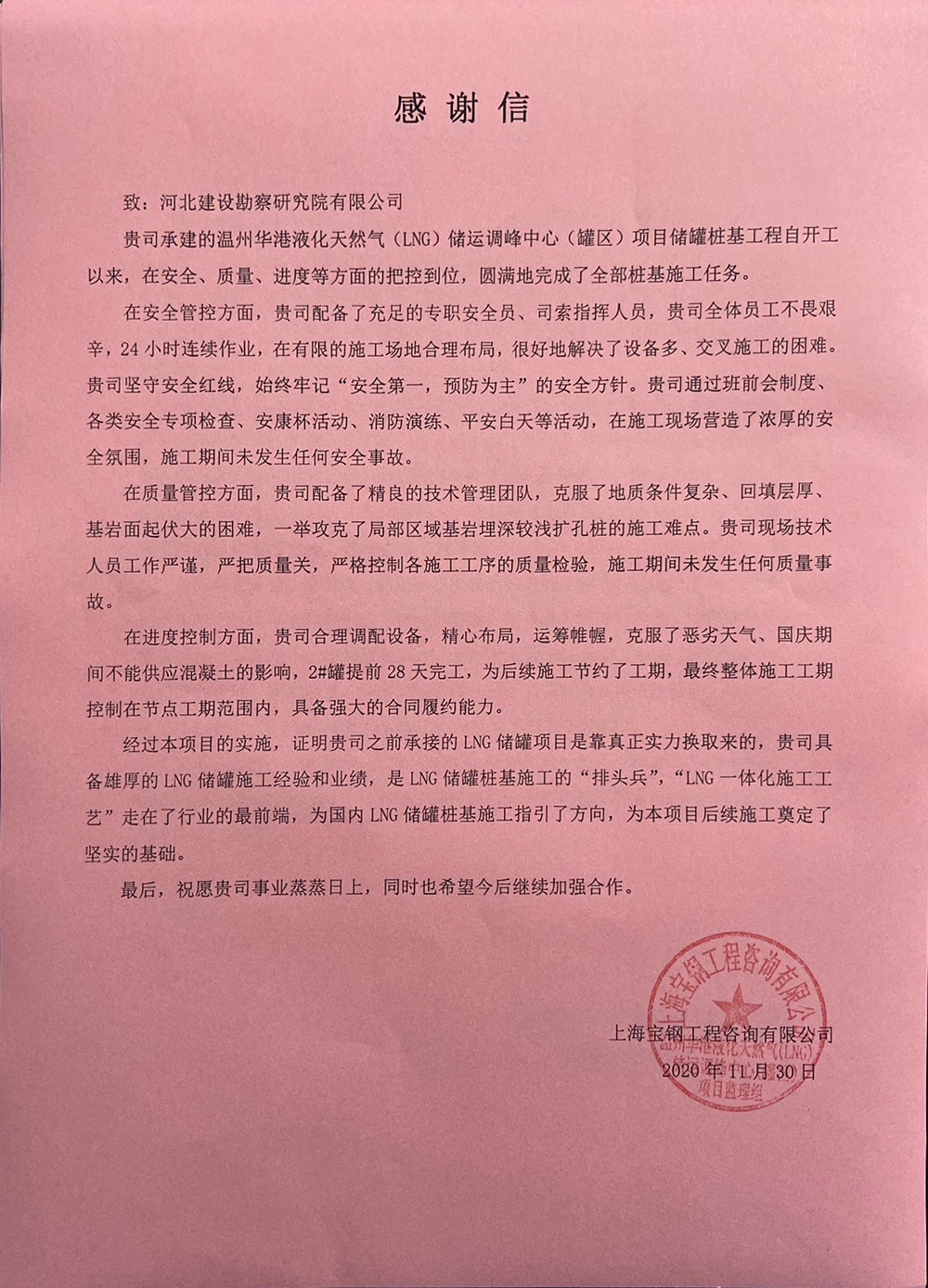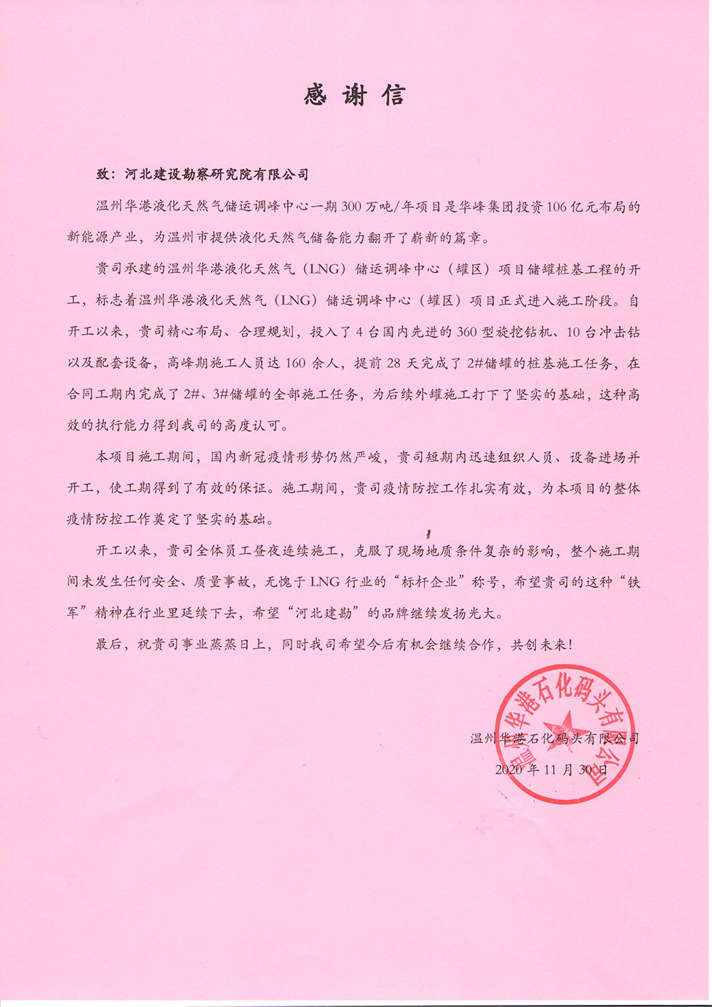 近日我公司溫州華港LNG項目部喜獲業(yè)主、總包、監(jiān)理的表揚(yáng)信,這是對項目部全體參建人員不畏艱難、頑強(qiáng)拼搏、攻堅克難的施工精神的認(rèn)可和贊揚(yáng),更是對河北建勘高度的肯定。