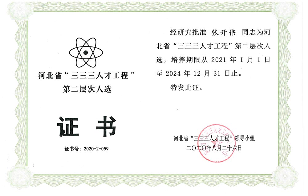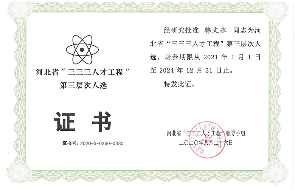 經(jīng)公司申報(bào)、石家莊市人力資源和社會(huì)保障局推薦,河北省“三三三人才工程”領(lǐng)導(dǎo)小組批準(zhǔn),公司張開(kāi)偉同志榮獲2020年度河北省“三三三人才工程”第二層次人選,韓文永、孫廣兩名同志榮獲2020年度河北省“三三三人才工程”第三層次人選。