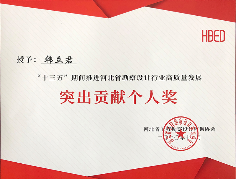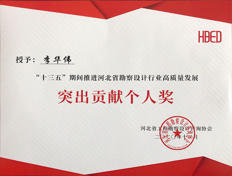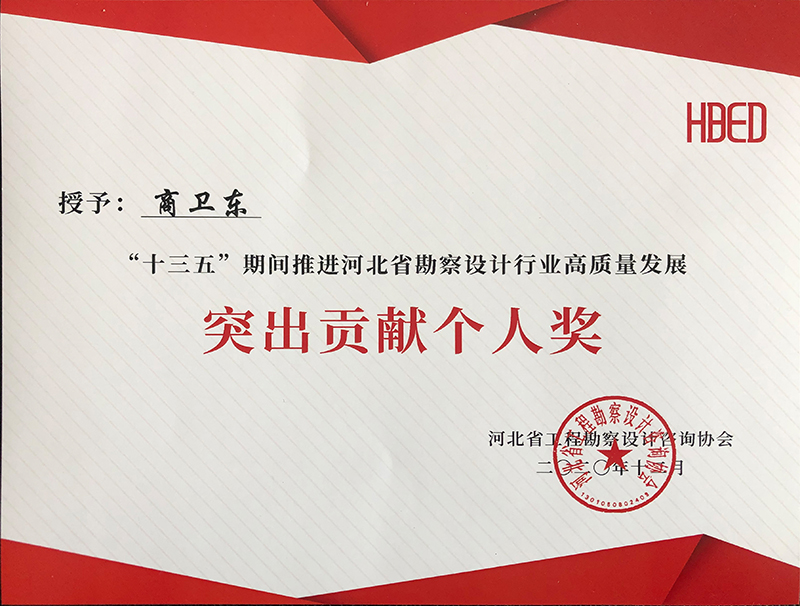 由河北省工程勘察設計咨詢協會評選,公司榮獲“十三五”期間推進河北省勘察設計行業(yè)高質量發(fā)展突出貢獻單位,韓立君董事長、李華偉總經理、商衛(wèi)東主任榮獲“十三五”期間“推進河北省勘察設計行業(yè)高質量發(fā)展突出貢獻個人”。