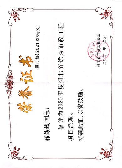 近日,由河北省市政工程協(xié)會(huì)評(píng)選,公司榮獲“2021年度河北省優(yōu)秀市政施工企業(yè)”稱號(hào);韓立君董事長(zhǎng)榮獲“2021年度河北省市政行業(yè)優(yōu)秀企業(yè)家”稱號(hào);孫運(yùn)青、狄艷林、高軍會(huì)、張海蛟四位同志榮獲“2020年度河北省優(yōu)秀市政工程項(xiàng)目經(jīng)理”稱號(hào)。