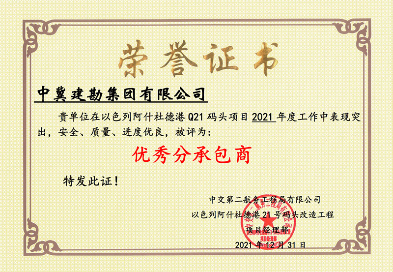 其中,以色列阿什杜德港Q21碼頭項(xiàng)目榮獲“優(yōu)秀分承包商”團(tuán)隊(duì)獎(jiǎng),李五一榮獲“優(yōu)秀項(xiàng)目經(jīng)理”、賀海亮榮獲“SHE管理先進(jìn)個(gè)人”、宋宇峰榮獲“優(yōu)秀質(zhì)量管理先進(jìn)個(gè)人”、張軍鋒榮獲“優(yōu)秀管理先進(jìn)個(gè)人”、李良啟、聶彥科榮獲“優(yōu)秀技術(shù)操作手”、劉宗正榮獲“優(yōu)秀電工”、張秋東榮獲“優(yōu)秀后勤”、趙杰榮獲“優(yōu)秀操作標(biāo)兵”榮譽(yù)稱號(hào)。