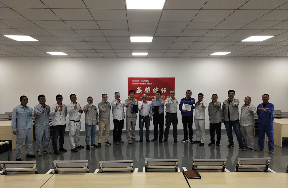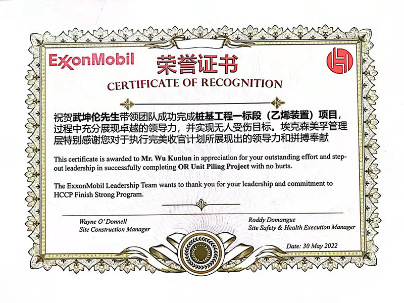 5月30日,??松梨冢ɑ葜荩┗び邢薰菊匍_(kāi)2022年工作表彰大會(huì),我公司參建的惠州美孚乙烯一期樁基工程項(xiàng)目部,在參建的30余家施工單位中以優(yōu)異的成績(jī),榮獲“優(yōu)秀管理團(tuán)隊(duì)”稱號(hào),生產(chǎn)設(shè)備科科長(zhǎng)兼項(xiàng)目經(jīng)理武坤倫榮獲 “卓越領(lǐng)導(dǎo)力”個(gè)人榮譽(yù)證書(shū),項(xiàng)目部每位員工都收到了業(yè)主頒發(fā)的獎(jiǎng)品。
