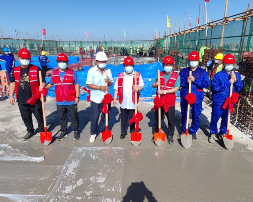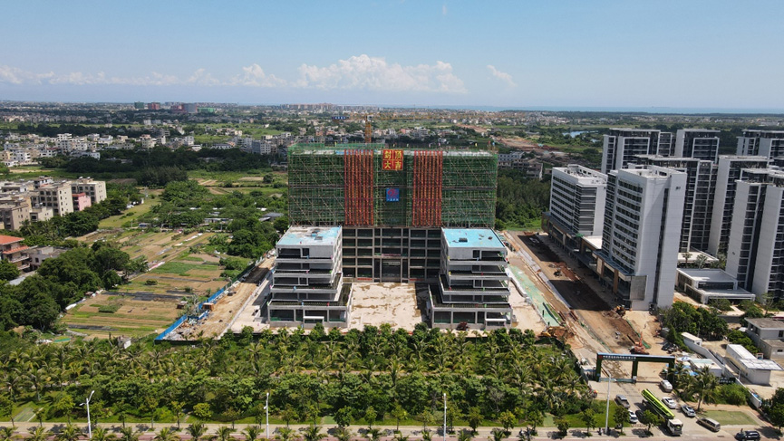 海南辦公樓占地面積15畝,地下二層,地上12層,總建筑面積47527平方米。工程自2021年9月13日現(xiàn)場舉辦開工儀式以來,經(jīng)過11個月的合力攻堅,克服高溫、臺風、疫情等重重難關,如期實現(xiàn)了一個個關鍵節(jié)點:2021年10月25日第一根基礎工程樁混凝土灌注順利完成;2021年12月4日開始8萬方土方開挖的任務;2022年1月29日,實現(xiàn)了基礎筏板的澆筑;2022年4月10日,完成了地下二層車庫施工,主體如期“沖”出正負零;2022年6月24日,東、西配樓主體按計劃日期封頂。如今項目迎來了主體封頂?shù)睦锍瘫瑸楹笃诠こ虡淞⒘藰藯U!