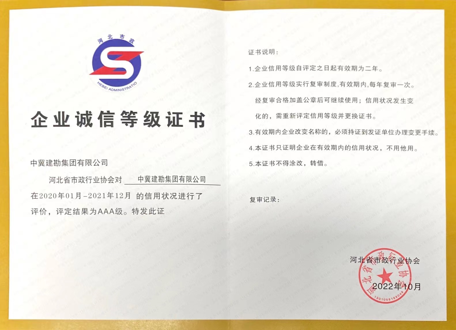 近日,河北省市政行業(yè)協(xié)會組織專家對行政主管部門初審推薦的誠信企業(yè)申報單位進行了集中評審,并經(jīng)領導小組審定和網(wǎng)上公示等程序,我公司被評定為2021年度河北省市政行業(yè)AAA級誠信企業(yè)。