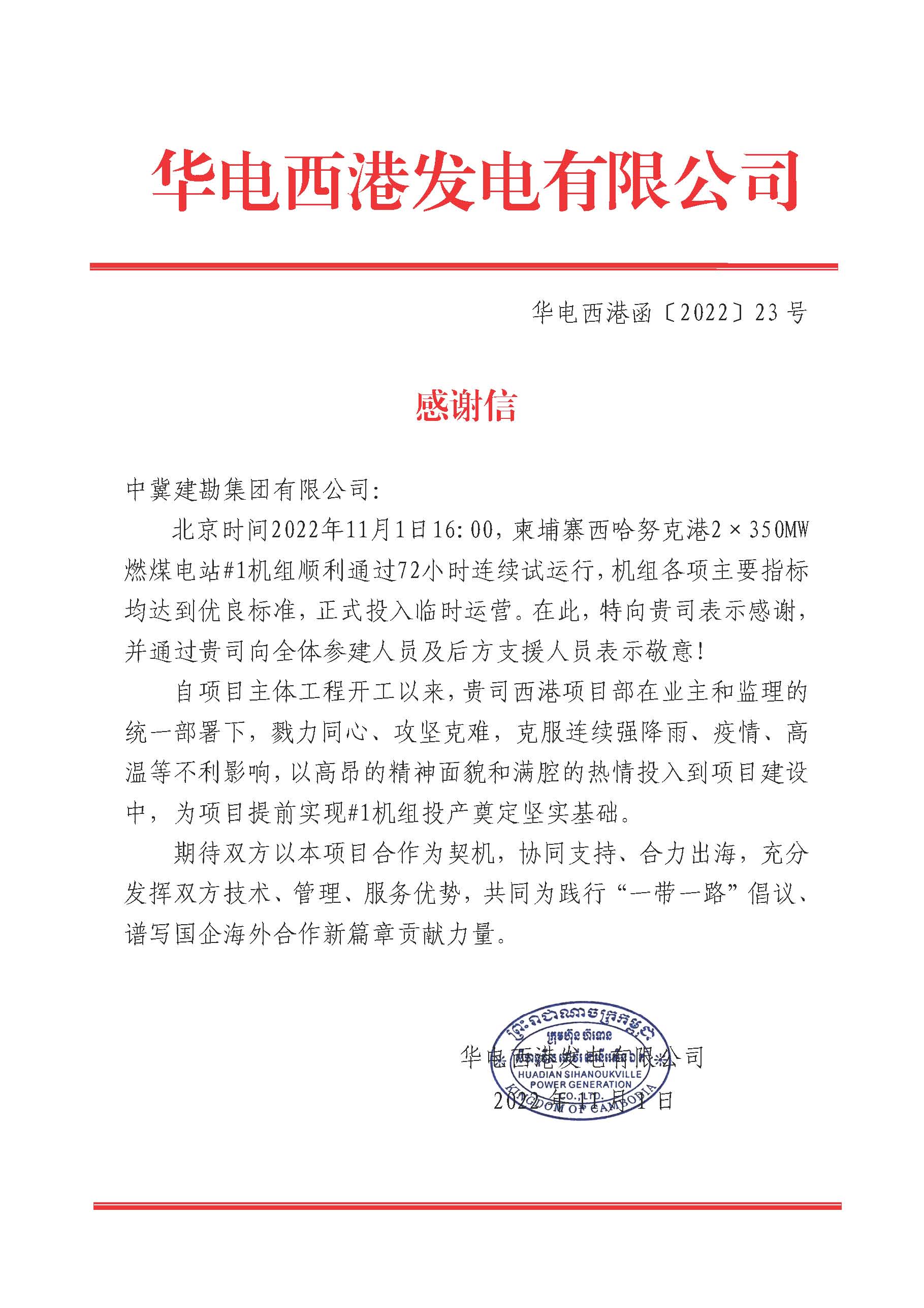 北京時(shí)間2022年11月1日16:00,由我公司承建的柬埔寨西哈努克港2×350MW燃煤電站#1機(jī)組順利通過柬埔寨國家電力公司要求的滿負(fù)荷性能試驗(yàn),標(biāo)志著中國華電在柬投資興建的最大火電項(xiàng)目首臺(tái)機(jī)組正式投產(chǎn)發(fā)電。該項(xiàng)目是中國華電在“一帶一路”沿線國家投資建設(shè)的重點(diǎn)工程,也是目前中國在柬單體投資最大電源項(xiàng)目。業(yè)主華電西港發(fā)電有限公司特向我公司表示感謝,并對(duì)我公司全體參建人員及后方支持人員表示敬意!