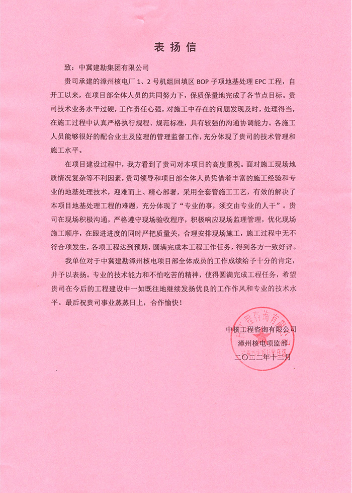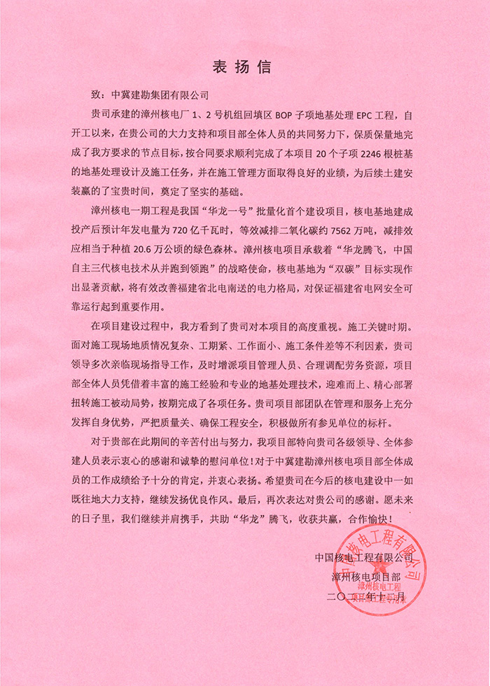 漳州核電一期工程是我國(guó)“華龍一號(hào)”批量化首個(gè)建設(shè)項(xiàng)目,承載著“華龍騰飛,中國(guó)自主三代核電技術(shù)從并跑到領(lǐng)跑”的戰(zhàn)略使命,核電基地為“雙碳”目標(biāo)實(shí)現(xiàn)作出顯著貢獻(xiàn),是國(guó)家核電建設(shè)的重點(diǎn)項(xiàng)目。在工程建設(shè)過(guò)程中面對(duì)規(guī)模較大、場(chǎng)地分散、交叉施工等多項(xiàng)不利因素,項(xiàng)目部迎難而上、精心部署、晝夜施工,確保安全、質(zhì)量的情況下按期完成了各項(xiàng)任務(wù)。項(xiàng)目部在谷習(xí)光同志的帶領(lǐng)下,在管理和服務(wù)上充分發(fā)揮自身優(yōu)勢(shì),積極爭(zhēng)當(dāng)所有參見單位的標(biāo)桿,得到了甲方和監(jiān)理的高度贊揚(yáng),為以后更多的合作奠定了堅(jiān)實(shí)基礎(chǔ)。