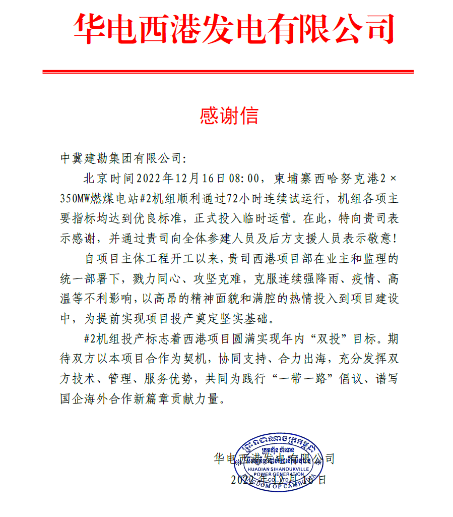 柬埔寨西哈努克港2×350MW燃煤電站#1機(jī)組順利通過(guò)柬埔寨國(guó)家電力公司要求的滿負(fù)荷性能試驗(yàn),標(biāo)志著中國(guó)華電在柬投資興建的最大火電項(xiàng)目首臺(tái)機(jī)組正式投產(chǎn)發(fā)電。自該項(xiàng)目主體工程開工以來(lái),西港項(xiàng)目部全體人員在業(yè)主和監(jiān)理的統(tǒng)一部署下,勠力同心、攻堅(jiān)克難,克服連續(xù)降雨、疫情、高溫等不利影響,以高昂的精神面貌和滿腔的熱情投入到項(xiàng)目建設(shè)中,為項(xiàng)目提前實(shí)現(xiàn)#1機(jī)組投產(chǎn)奠定堅(jiān)實(shí)基礎(chǔ)。