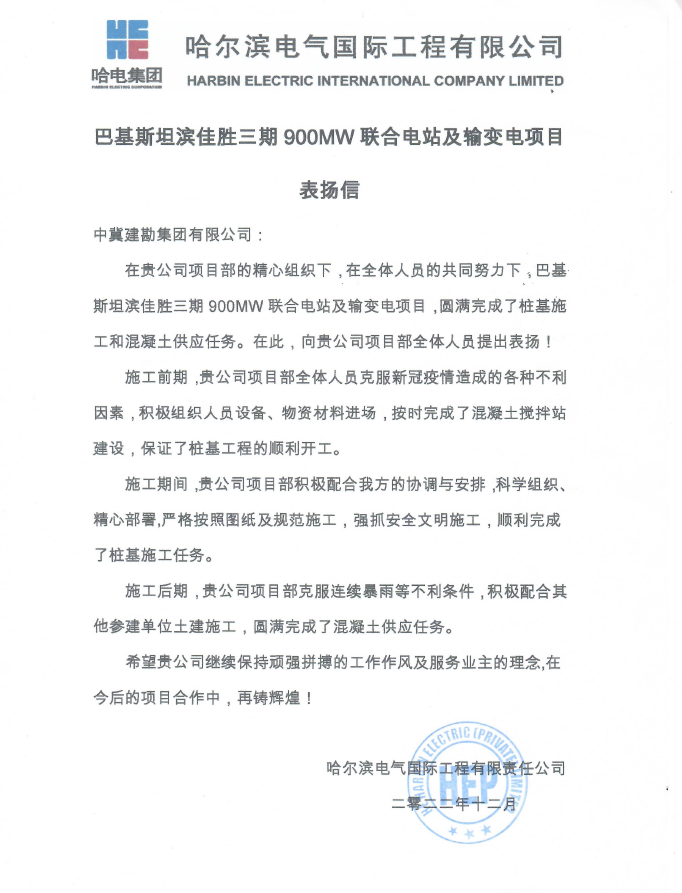 巴基斯坦濱佳勝三期900MW聯(lián)合電站及輸變電項(xiàng)目,圓滿完成了樁基施工和混凝土供應(yīng)任務(wù)。施工期間,項(xiàng)目部員工積極配合業(yè)主的協(xié)調(diào)與安排,科學(xué)組織、精心部署,嚴(yán)格按照?qǐng)D紙及規(guī)范施工,在克服連續(xù)暴雨等不利條件,搶抓安全文明施工,確保圓滿完成施工任務(wù)。我們頑強(qiáng)拼搏的工作作風(fēng)及服務(wù)業(yè)主的理念得到了業(yè)主的高度認(rèn)可。