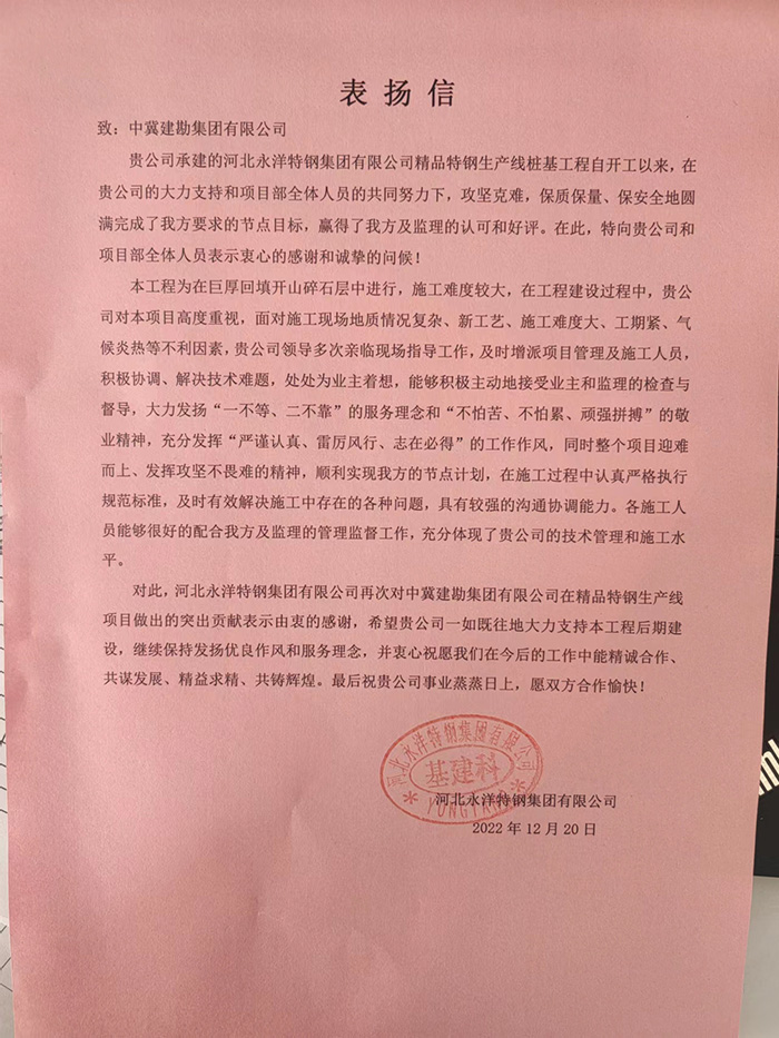 河北永洋特鋼集團(tuán)有限公司精品特鋼生產(chǎn)線樁基工程自開工以來(lái),在項(xiàng)目部全體人員的共同努力下,攻堅(jiān)克難,保質(zhì)保量保安全地圓滿完成了業(yè)主要求的節(jié)點(diǎn)目標(biāo),大力發(fā)揚(yáng)“一不等、二不靠”的服務(wù)理念和“不怕苦、不怕累、頑強(qiáng)拼搏”的敬業(yè)精神,贏得了業(yè)主及監(jiān)理的認(rèn)可和好評(píng)。