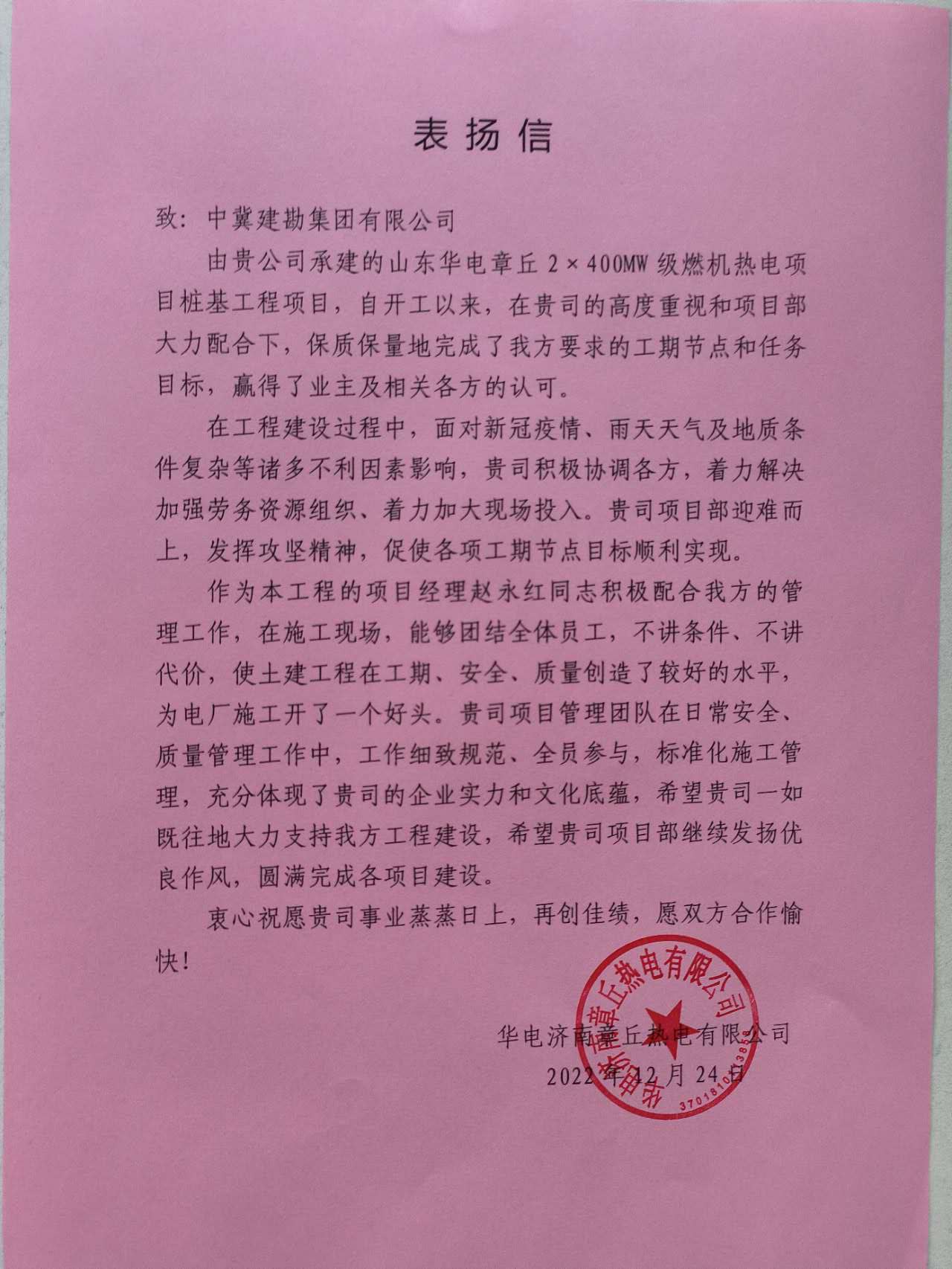 山東華電章丘2×400MW級(jí)燃機(jī)熱電項(xiàng)目樁基工程,在工程建設(shè)過(guò)程中,面對(duì)新冠疫情、雨天天氣及地質(zhì)條件復(fù)雜等諸多不利影響,在項(xiàng)目經(jīng)理趙永紅同志的帶領(lǐng)下,能夠團(tuán)結(jié)一致,不講條件,使土建工程在工期、安全、質(zhì)量創(chuàng)造了較好的水平,為電廠施工開了一個(gè)好頭。項(xiàng)目管理團(tuán)隊(duì)在日常安全、質(zhì)量管理工作中,工作細(xì)致規(guī)范、標(biāo)準(zhǔn)化施工管理,充分體現(xiàn)了我公司的企業(yè)實(shí)力和文化底蘊(yùn)。