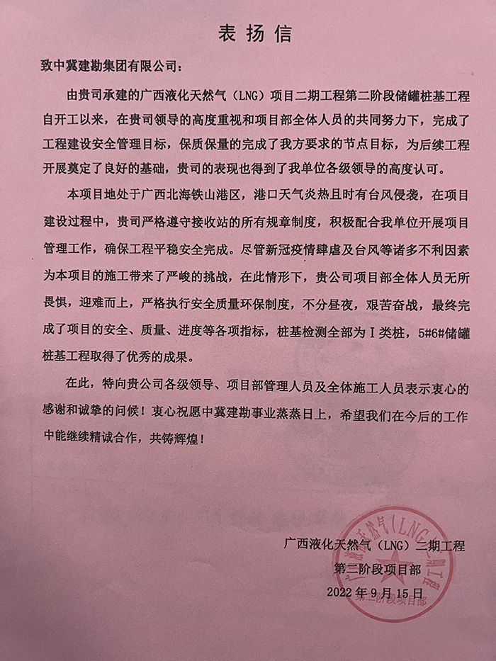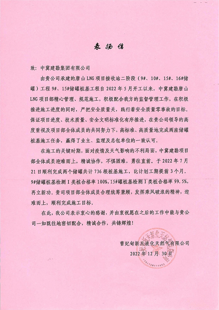 2022年12月30日我公司收到業(yè)主曹妃甸新天液化天然氣有限公司發(fā)來的表揚(yáng)信。由我公司承建的唐山LNG項(xiàng)目接收站二階段(9#、10#、15#、16#儲(chǔ)罐)工程9#、15#儲(chǔ)罐樁基工程,主要施工內(nèi)容為736根樁徑1.4m、樁長(zhǎng)71m/74m混凝土灌注樁,本項(xiàng)目自2022年5月31日開工以來,在唐山LNG項(xiàng)目部精心管理、規(guī)范施工下,嚴(yán)把安全質(zhì)量關(guān),踐行著安全質(zhì)量零事故目標(biāo),于2022年7月21日順利完成所有施工任務(wù),贏得業(yè)主、監(jiān)理及總包的一致認(rèn)可。樁基檢測(cè)完成后,9#儲(chǔ)罐樁基檢測(cè)I類樁率100%,15#儲(chǔ)罐I類樁率99.5%,再創(chuàng)新高。在施工過程中,項(xiàng)目部全體成員面對(duì)惡劣天氣的不利影響及新冠疫情肆虐的局面,迎難而上,精誠(chéng)協(xié)作,砥礪前行,淋漓盡致地詮釋了建勘人的鐵軍精神,為項(xiàng)目順利完成奠定堅(jiān)實(shí)基礎(chǔ)。