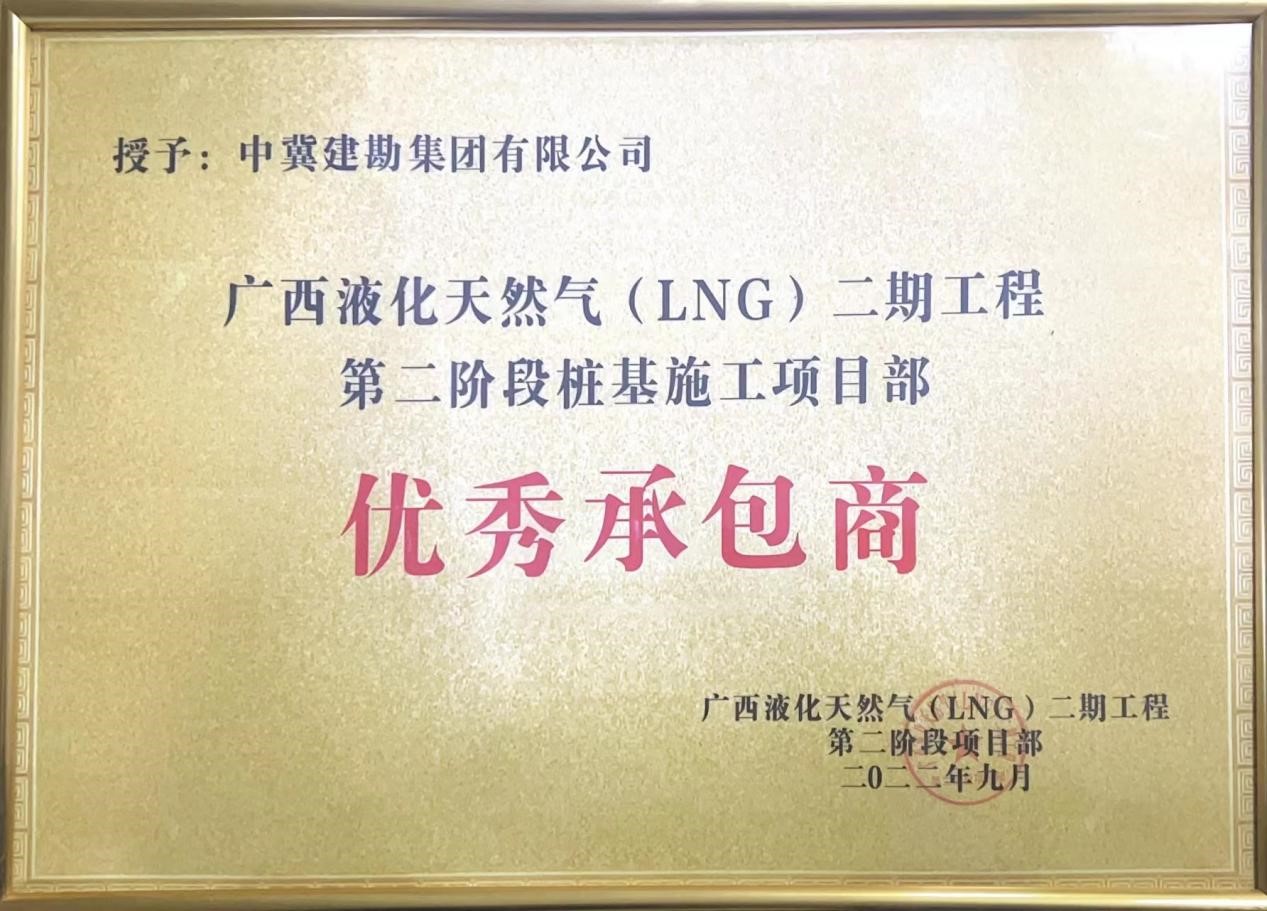 廣西液化天然氣LNG項(xiàng)目5#6#儲(chǔ)罐樁基項(xiàng)目是國(guó)家管網(wǎng)集團(tuán)北海液化天然氣有限責(zé)任公司非常重視的項(xiàng)目。我公司自2022年04月承接了廣西LNG二期項(xiàng)目?jī)?chǔ)罐樁基施工,本項(xiàng)目于2022年5月20日開始,7月11日完成。從施工開始,本項(xiàng)目24小時(shí)晝夜不間斷施工,為保障工程高質(zhì)量高效率完成,施工期間,建設(shè)單位、PMC單位、監(jiān)理單位及施工單位配備了充足的管理人員及施工人員,在疫情肆虐,天氣炎熱,雨季臺(tái)風(fēng)等一系列困難重重之下,廣西LNG項(xiàng)目部全體員工保持高度的工作熱情,克服一切艱難險(xiǎn)阻,順利完成了樁基施工全部任務(wù)。樁基檢測(cè)結(jié)果全部為Ⅰ類樁,保質(zhì)保量的完成了各個(gè)里程碑節(jié)點(diǎn)目標(biāo),榮獲國(guó)家管網(wǎng)集團(tuán)北海液化天然氣有限責(zé)任公司廣西北海LNG二期項(xiàng)目部的表揚(yáng)信及優(yōu)秀優(yōu)秀承包商集體榮譽(yù)。