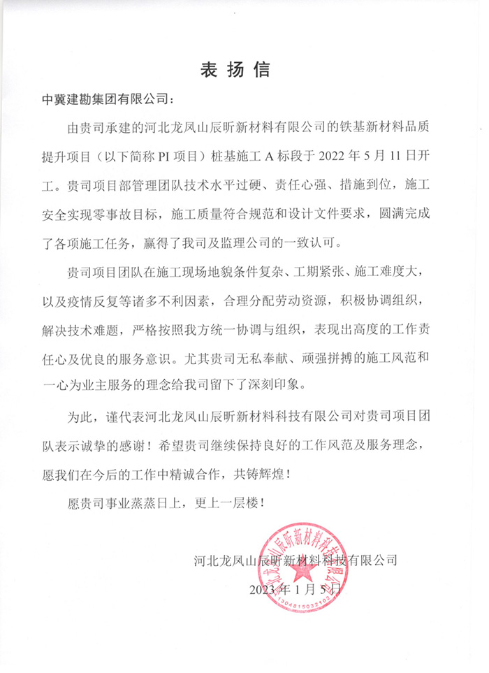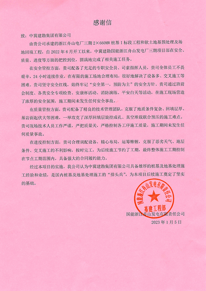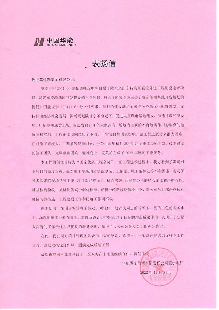 我公司華能甘肅正寧電廠二期工程項(xiàng)目部收到業(yè)主方華能隴東能源公司正寧電廠發(fā)來的表揚(yáng)信,施工期間,在項(xiàng)目領(lǐng)導(dǎo)的帶領(lǐng)下,憑借出色的業(yè)務(wù)水平、深厚的施工經(jīng)驗(yàn)在業(yè)主、監(jiān)理及設(shè)計(jì)方中間起到了良好的溝通橋梁作用。本工程的創(chuàng)優(yōu)目標(biāo)為“國(guó)家優(yōu)質(zhì)工程金獎(jiǎng)”,我單位負(fù)責(zé)的B標(biāo)段樁基檢測(cè)驗(yàn)收I類樁比例高于創(chuàng)優(yōu)標(biāo)準(zhǔn)。在新一輪新冠疫情沖擊下,項(xiàng)目部嚴(yán)格執(zhí)行疫情防控措施,工程建設(shè)工作和防疫工作兩不誤表現(xiàn)出了建勘人高度的工作責(zé)任心及優(yōu)良的服務(wù)意識(shí),贏得了華能隴東能源公司領(lǐng)導(dǎo)及員工的充分肯定。