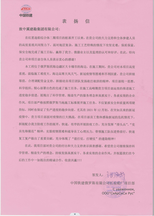 俄羅斯海參崴紅星造船綜合體(二期)項(xiàng)目,收到中國(guó)鐵建俄羅斯紅星船廠項(xiàng)目部的表揚(yáng)信,施工期間,在項(xiàng)目領(lǐng)導(dǎo)的帶領(lǐng)下,項(xiàng)目部統(tǒng)一思想、科學(xué)組織,經(jīng)過305天的奮戰(zhàn),項(xiàng)目部完成了質(zhì)量安全零事故,保質(zhì)保量促進(jìn)生產(chǎn)的任務(wù)目標(biāo)。我公司負(fù)責(zé)的302、303、304廠房樁基檢測(cè)驗(yàn)收全部合格。在施工高峰期克服了 新冠疫情、高寒天氣、俄烏戰(zhàn)爭(zhēng)影響等諸多困難和不利因素,采取24小時(shí)不間斷施工,積極調(diào)配合理高效的推進(jìn)施工進(jìn)度穩(wěn)步前進(jìn)。尤其在突如其來的新冠疫情中,項(xiàng)目部面對(duì)疫情的巨大挑戰(zhàn),積極采取措施,配合防疫工作的展開,快速,有序的開展隔離工作,安撫感染人員恐慌情緒。這種科學(xué)防疫、積極組織為后期快速?gòu)?fù)工復(fù)產(chǎn)做出了重要貢獻(xiàn),得到了總包單位的充分肯定和表揚(yáng)。
