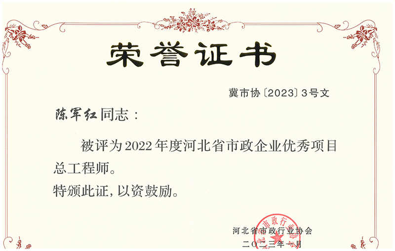 近日,經(jīng)河北省市政行業(yè)協(xié)會組織選拔并發(fā)文公布,我公司王慶軍同志、呂琳同志榮獲 “2021年度河北省市政企業(yè)優(yōu)秀項目經(jīng)理” 榮譽稱號;陳軍紅同志、張樹楹同志榮獲“2022年度河北省市政企業(yè)優(yōu)秀項目總工程師”榮譽稱號。