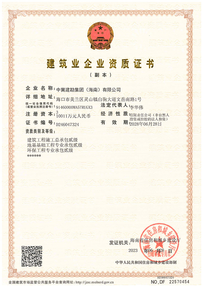 中冀建勘集團(海南)有限公司喜獲建筑業(yè)企業(yè)貳級資質(zhì)證書