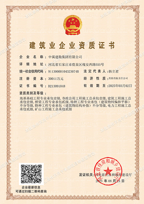 集團公司于2023年8月24日喜獲電力工程施工總承包貳級資質,該資質的取得將大力促進我公司在電力能源市場的業(yè)務拓展能力,由電力項目的地基基礎專業(yè)承包向土建、安裝總成承包邁進,為獨立承接風電、光電等電力新能源項目提供了準入證。