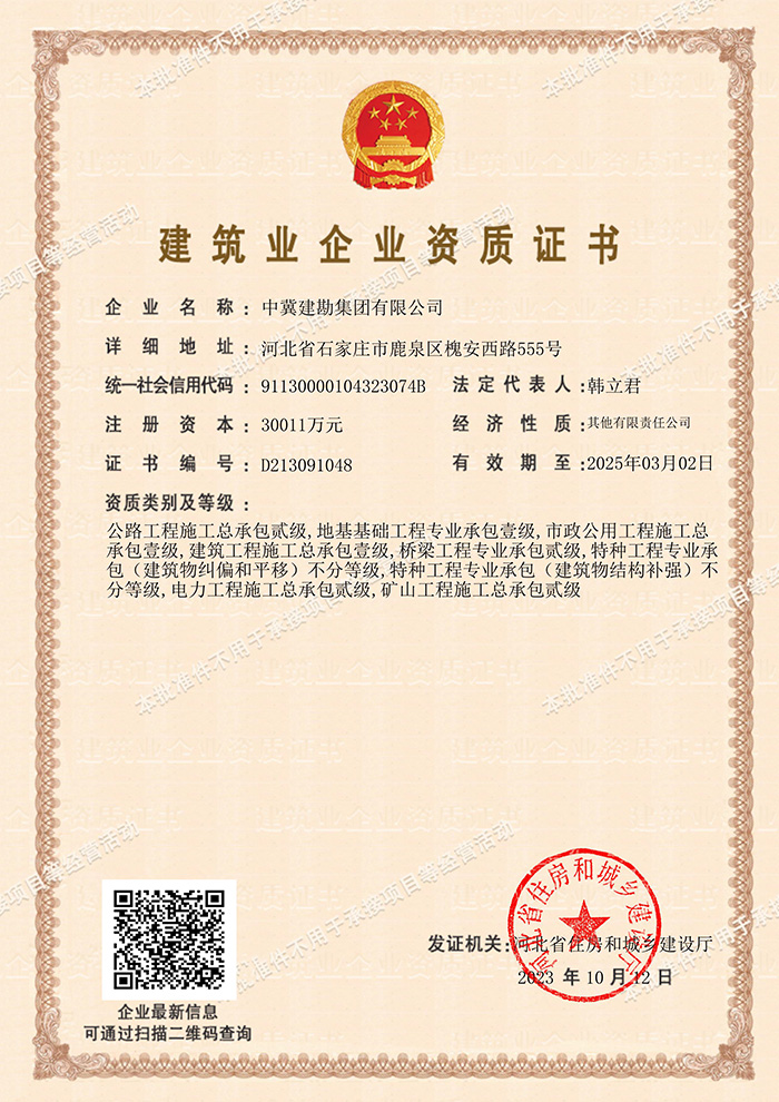 為拓展公司業(yè)務(wù)范圍,在公司領(lǐng)導(dǎo)的精心策劃下,經(jīng)過安全生產(chǎn)部的不懈努力,集團(tuán)公司于2023年10月12日經(jīng)河北省交通廳、河北省住建廳審核批準(zhǔn),成功取得了公路工程施工總承包貳級(jí)資質(zhì),該資質(zhì)的取得將為集團(tuán)公司拓展縣、鄉(xiāng)、村公路工程業(yè)務(wù)提供了先決條件,為增強(qiáng)地方市場的開拓能力、提高地方市場競爭力提供有力支撐,將在助力集團(tuán)公司高質(zhì)量發(fā)展、升級(jí)轉(zhuǎn)型上貢獻(xiàn)更大力量。