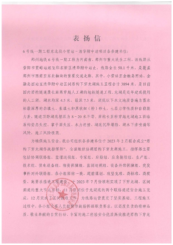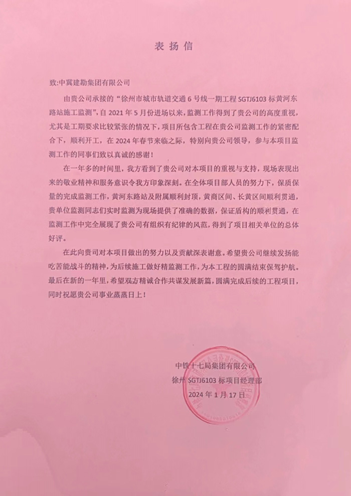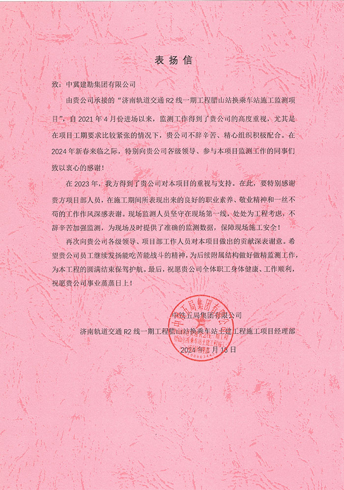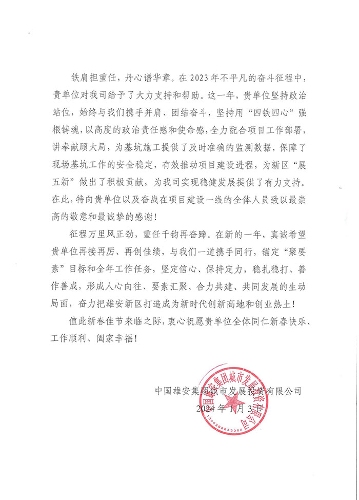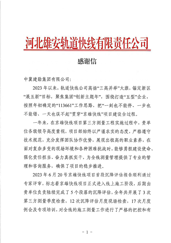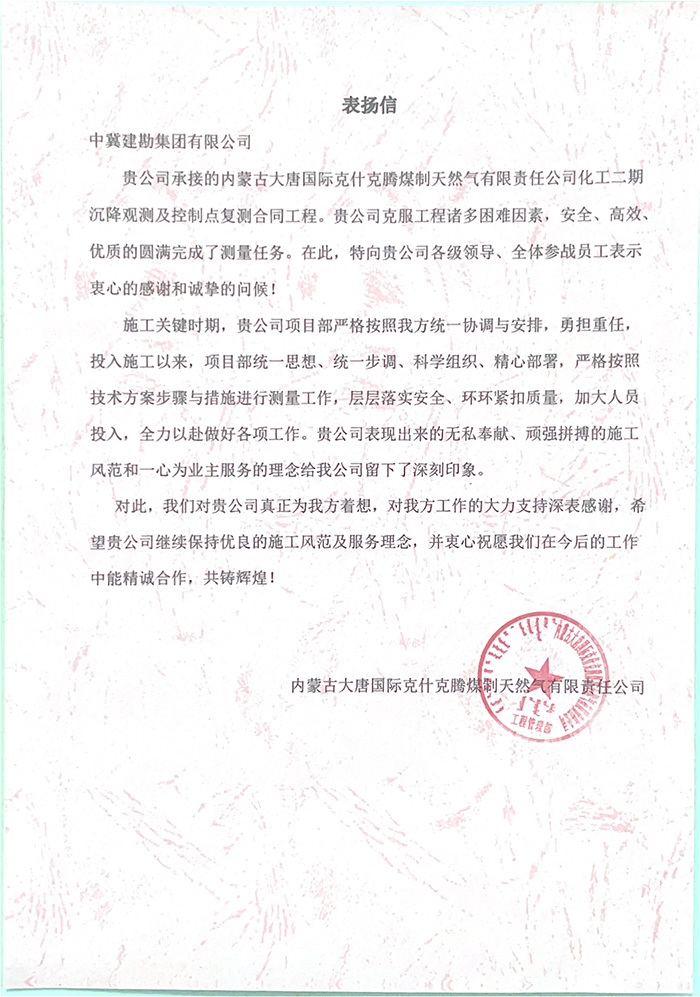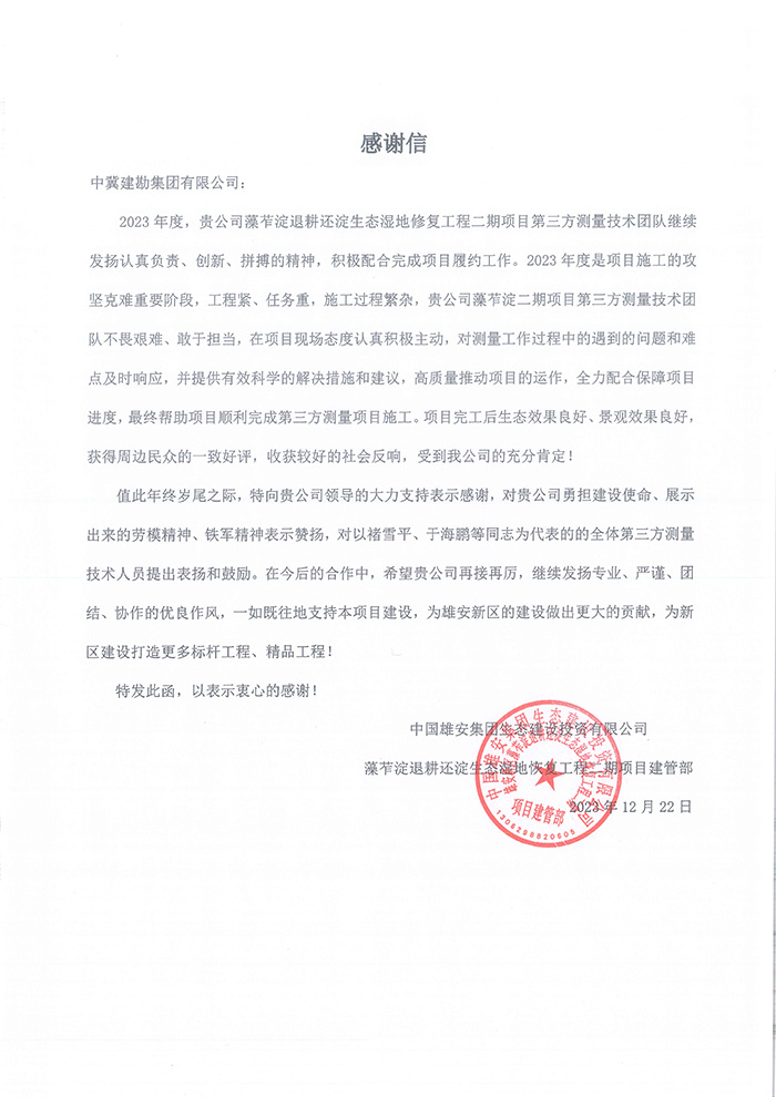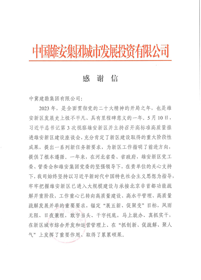 近期,集團(tuán)公司陸續(xù)收到中國(guó)雄安集團(tuán)城市發(fā)展投資有限公司、河北雄安軌道快線有限責(zé)任公司、中國(guó)雄安集團(tuán)生態(tài)建設(shè)投資有限公司、中鐵五局、中鐵十七局、鄭州地鐵集團(tuán)、內(nèi)蒙古大唐國(guó)際克什克騰旗煤制天然氣電廠、大唐內(nèi)蒙古多倫電廠等業(yè)主單位發(fā)來(lái)的感謝信。我公司認(rèn)真負(fù)責(zé)、敢打能打硬仗的工作態(tài)度、頑強(qiáng)拼搏的施工風(fēng)范和一心為業(yè)主服務(wù)的理念,贏得了業(yè)主的高度認(rèn)可和贊揚(yáng),特發(fā)來(lái)感謝信深表感謝!