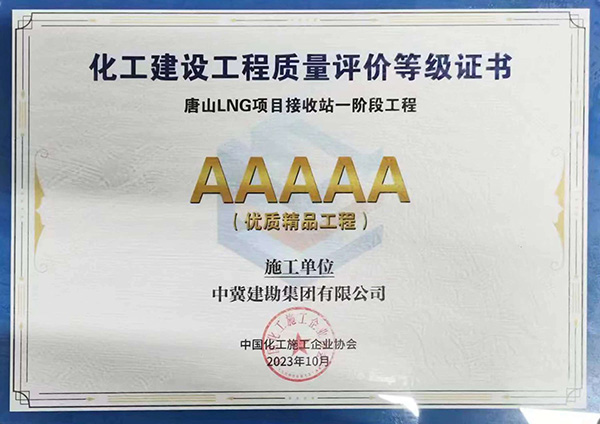 唐山LNG項(xiàng)目接收站一階段工程榮獲化工行業(yè)“AAAAA優(yōu)質(zhì)精品工程”