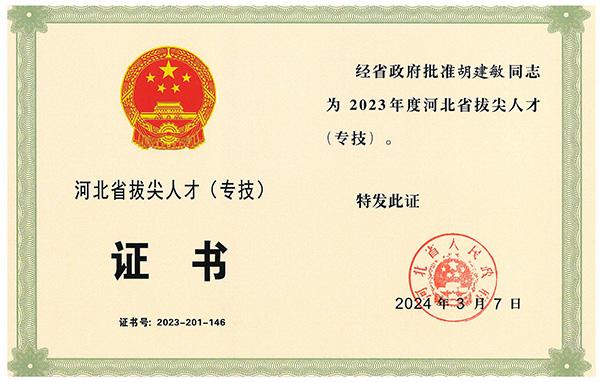 經(jīng)公司組織申報(bào),石家莊市鹿泉區(qū)人民政府、石家莊市人民政府推薦,河北省人力資源和社會(huì)保障廳組織評(píng)審、答辯,河北省人民政府批準(zhǔn),胡建敏同志榮獲2023年度河北省拔尖人才(專技)。