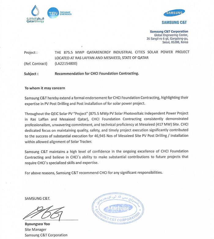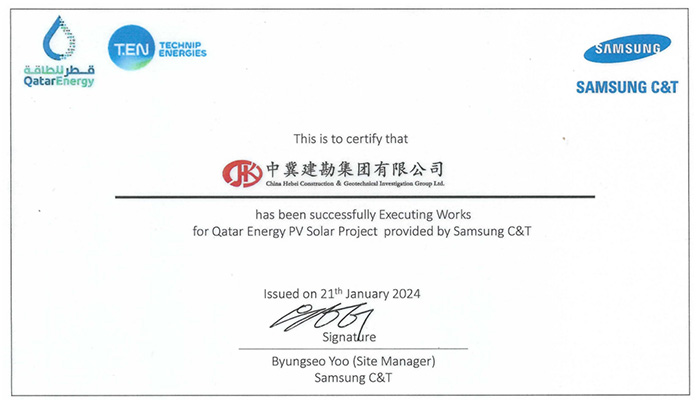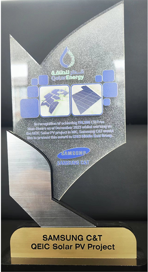 我公司收到卡塔爾能源875.5MW光伏發(fā)電項目業(yè)主方卡塔爾能源和總包方三星C&T公司聯(lián)合頒發(fā)的獎杯和推薦信。業(yè)主及總包方高度認可我公司項目履約能力,贊揚我司對該項目成功交付做出重大貢獻,表示愿意與我司建立長期合作關系。基于我司卓越的履約表現(xiàn),三星C&T公司授予我司推薦信。
