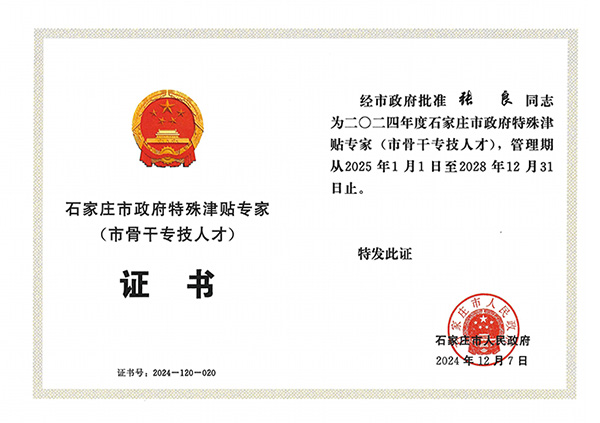 經(jīng)公司組織申報(bào),石家莊市鹿泉區(qū)人民政府推薦、石家莊市人力資源和社會(huì)保障局組織評(píng)審,石家莊市人民政府批準(zhǔn),我公司張良同志榮獲石家莊市政府特殊津貼專家(市骨干專技人才)稱號(hào)。