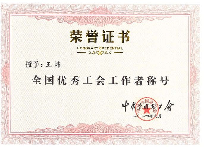 王煒同志榮獲中華全國總工會“全國優(yōu)秀工會工作者”榮譽稱號