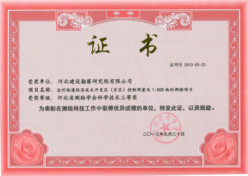 近日,由工程測量公司完成的滄州臨港經(jīng)濟技術(shù)開發(fā)區(qū)(東區(qū))控制測量及1:500地形測繪項目,被河北省測繪學會評為河北省測繪學會科學技術(shù)三等獎。